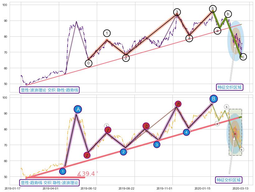 ➢ 波浪理论与趋势线信号事件周期长度级别相同,同周期信号事件