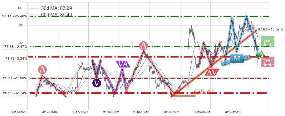 ♘ 支撑价格位71.76,可信任强度79.36%,距离最后交易2020-03-13形成的收盘价格75.81相差 -5.34%