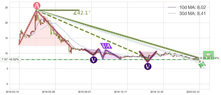 🦴 长线均值回复组合短线趋势跟踪[强阻力信号]2019-04-18-2020-03-13下跌趋势依然成立(下跌趋势跟踪依然存在),短线价格略微上行反弹(均值回复猜想),即将接近下跌趋势提供的未破位阻力价格:8.34。