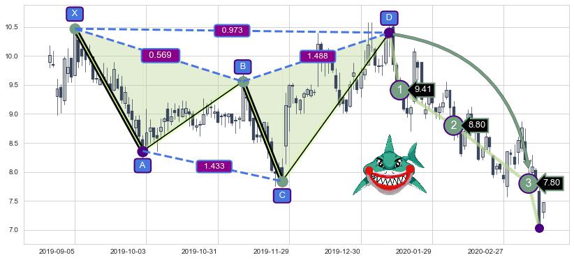 ➢ 谐波鲨鱼:d下跌已到达第❸目标:猜想支撑拉升 → 上涨 →【拐点】机会信号 → 大趋势均值回复