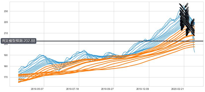 ➣ 40小时均线于(2020-02-21: 223.14)形成【死叉】基于【死叉历史模型】预测死叉后最低波谷价格: 209.55, 死叉后最低价格177.32,已经下跌超出预测最低波谷价格, 预期反弹