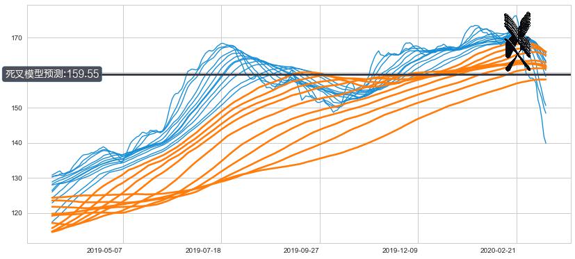 ➣ 35小时均线于(2020-02-21: 171.29)形成【死叉】基于【死叉历史模型】预测死叉后最低波谷价格: 162.69, 死叉后最低价格129.99,已经下跌超出预测最低波谷价格, 预期反弹