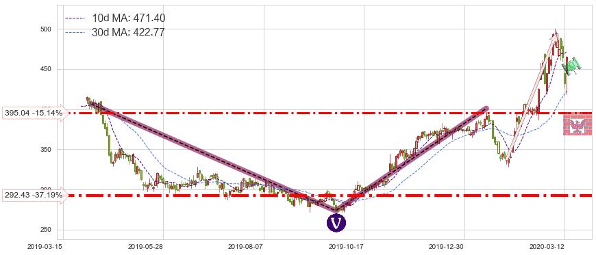 ♘ 支撑价格位395.04,可信任强度65.42%,距离最后交易2020-03-13形成的收盘价格465.55相差 -15.14%