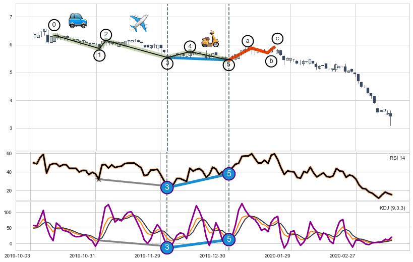 ➣ 第三,五驱动浪端点:【KDJ】走势出现【常规背离 & 反转信号】背离程度99.00%,背离夹角角度28.2˚,背离程度较大