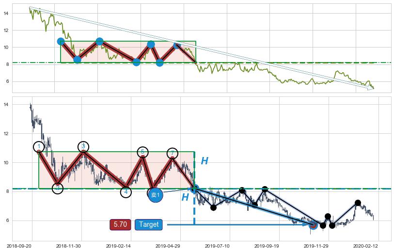 ➢ 【多方力量耗尽】已在2019-05-17突破矩形提供的【支撑】颈线 8.21 →箱形震荡盘整结束