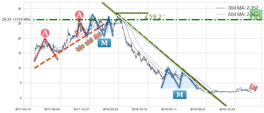 从2018-05-15至2019-09-20,共包含341个交易日,阶段股价下跌-216.72%,阶段股价变动位移路程比: 1 : 5,下跌趋势角度: 54.9
