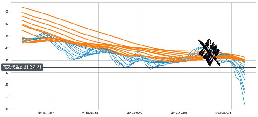 ➣ 90小时均线于(2020-01-23: 36.36)形成【死叉】基于【死叉历史模型】预测死叉后最低波谷价格: 30.52, 死叉后最低价格14.42,已经下跌超出预测最低波谷价格, 预期反弹