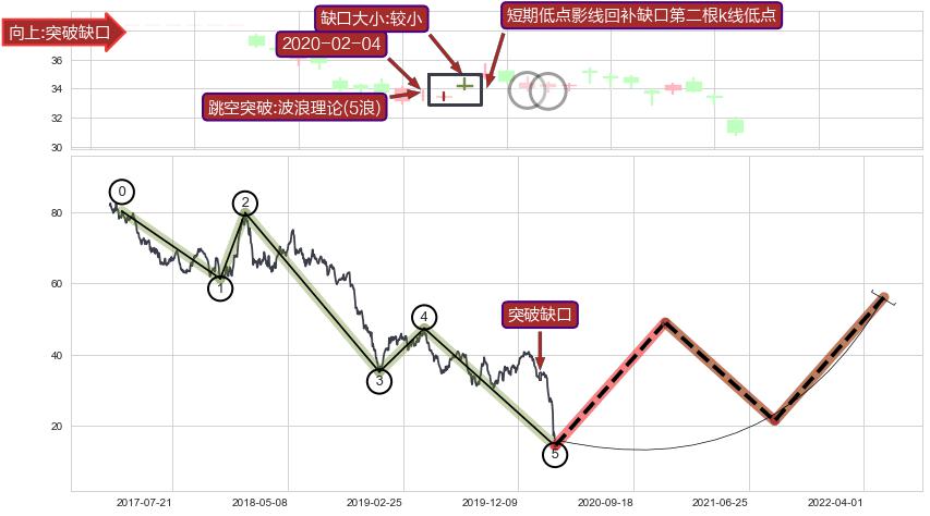➣ 突破缺口形成后,后续k已经超过14根,跳空突破波浪理论(5浪)关键点后, 出现【轻微回踩】迹象,短期低点影线回补缺口第二根k线低点