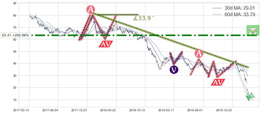 从2018-01-22至2020-03-13,共包含540个交易日,阶段股价下跌-142.00%,阶段股价变动位移路程比: 1 : 6,下跌趋势角度: 33.9