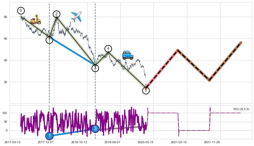 ➣ 第一, 三驱动浪端点:【KDJ】走势出现【常规背离 & 反转信号】背离程度85.29%,背离夹角角度74.0˚,背离程度较小