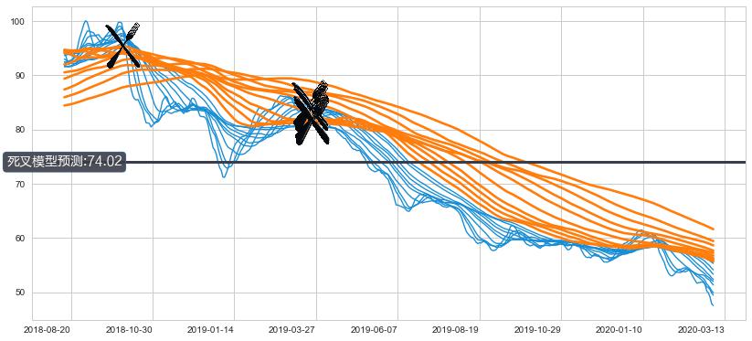 ➣ 60小时均线于(2019-03-22: 81.48)形成【死叉】基于【死叉历史模型】预测死叉后最低波谷价格: 74.58, 死叉后最低价格45.06,已经下跌超出预测最低波谷价格, 预期反弹