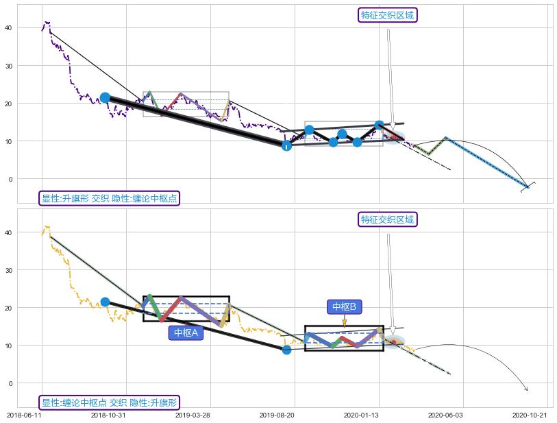 ➣ 缠论中枢点:猜想破位中枢B后持续下拉 → 下跌 → 破位中枢B支撑 → 持续趋势跟踪