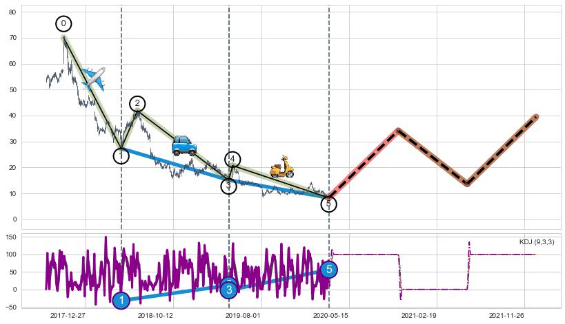 ➣ 第三,五驱动浪端点:【KDJ】走势出现【常规背离 & 反转信号】背离程度99.00%,背离夹角角度68.1˚,背离程度较大
