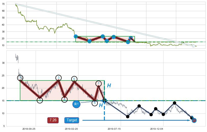 ➣ 下跌矩形整理:猜想预期下跌目标target即将达成,随后猜想强支撑来临,预期反弹上涨(均值回复)