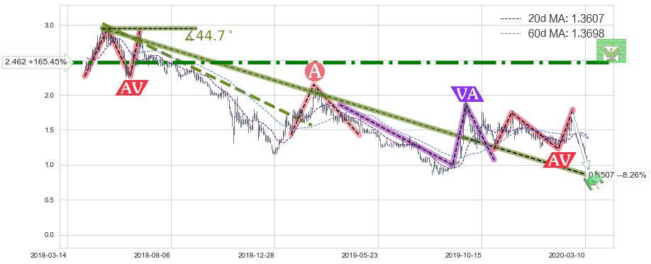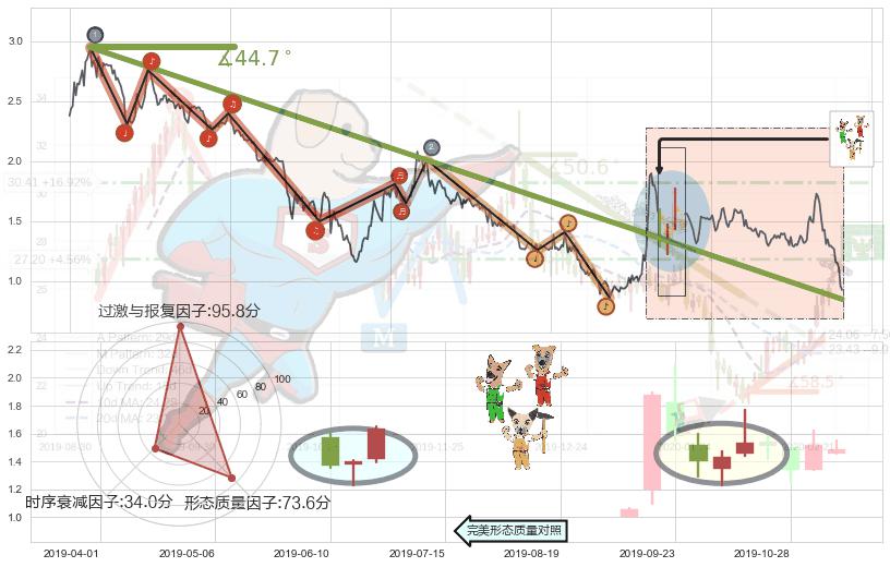 从2018-05-02至2019-09-20,共包含350个交易日,阶段股价下跌-20.20%,阶段股价变动位移路程比: 1 : 44,下跌趋势角度: 44.7