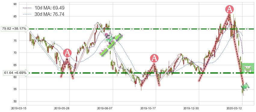♘ 阻力价格位79.82,可信任强度62.87%,距离最后交易2020-03-13形成的收盘价格57.77相差 +38.17%