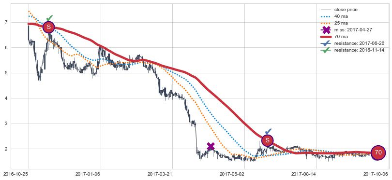 ➢ 最优均线组合共正确确认支撑阻力信号6处,正确确认率 40.00%