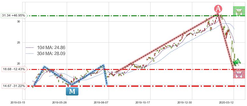 ♘ 支撑价格位18.68,可信任强度59.33%,距离最后交易2020-03-13形成的收盘价格21.33相差 -12.43%