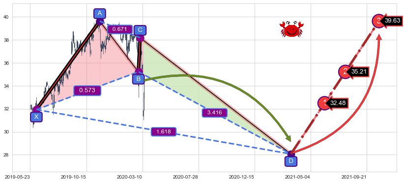 ➣ 谐波螃蟹:猜想c点拉升接近b点后强阻力来临下沉下跌(均值回复)