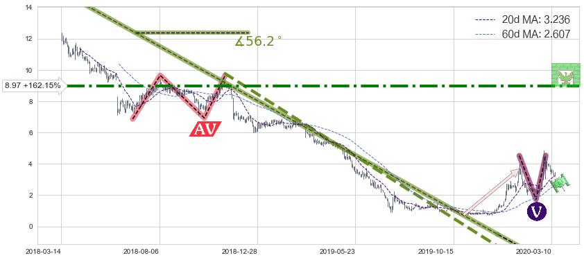 ➣ 2018-03-15-2019-12-18下跌趋势存在反转上涨[机会],其原下跌趋势的阻力位(-2.5310435)已被突破[强支撑信号],原下跌趋势角度: 56.2˚