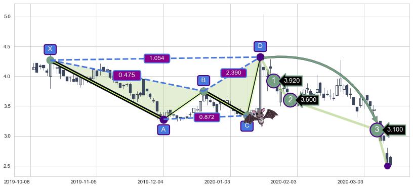 ➣ 已完成【蝙蝠】形态起点X: 2019-10-16, 终点D: 2020-01-16, 共64交易日