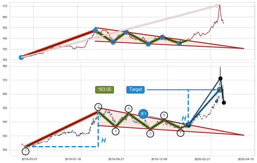 ➣ 降楔型:上涨目标target已达成:猜想强阻力位临近,预期回调下跌(均值回复)