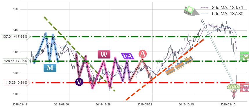➢ 【已达成】最小【整理】第一目标价格→(2020-03-12: 113.34 ), 后续继续【整理】下跌动力依然存在,下跌空间适中