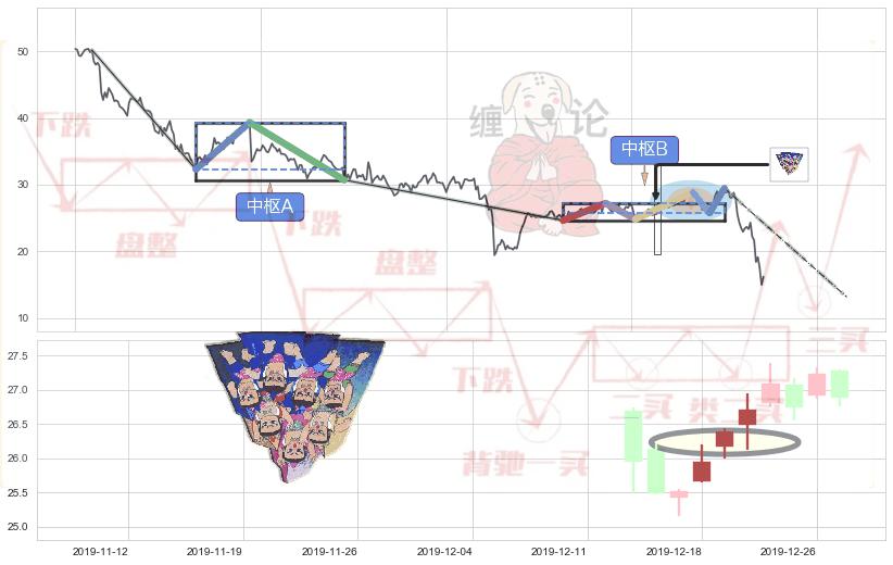 ➢ 【中枢B】:2019-10-08-2020-02-12,中枢由6笔构成,共88交易日, ZG=27.23, ZD=25.77