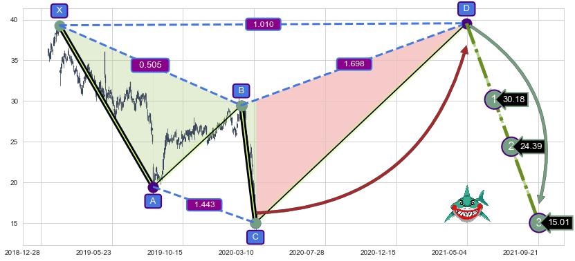 ➣ 谐波鲨鱼:b持续蓄力下跌击穿越过c:猜想报复性拉升 → 上涨 →【拐点】强支撑临近 → 大趋势均值回复
