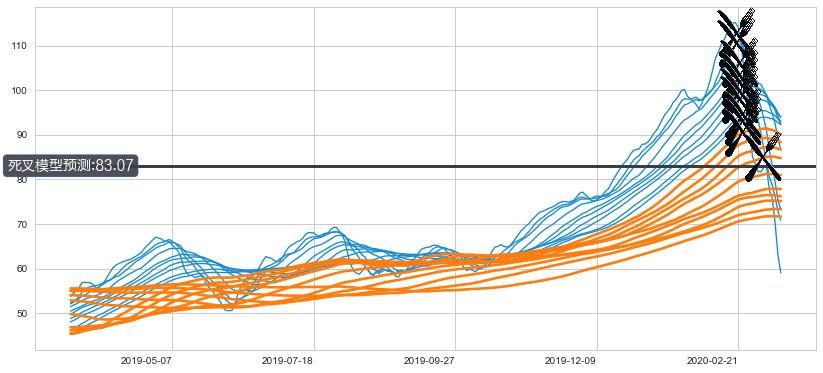 ➣ 70小时均线于(2020-02-24: 90.40)形成【死叉】基于【死叉历史模型】预测死叉后最低波谷价格: 77.58, 死叉后最低价格44.76,已经下跌超出预测最低波谷价格, 预期反弹