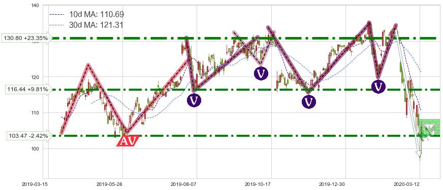 ♘ 阻力价格位103.47,可信任强度71.95%,距离最后交易2020-03-13形成的收盘价格106.04相差 -2.42%