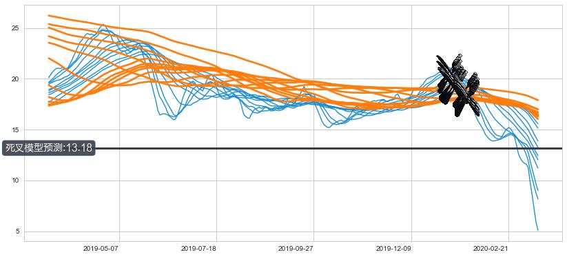 ➣ 90小时均线于(2020-01-21: 18.10)形成【死叉】基于【死叉历史模型】预测死叉后最低波谷价格: 12.23, 死叉后最低价格4.62,已经下跌超出预测最低波谷价格, 预期反弹