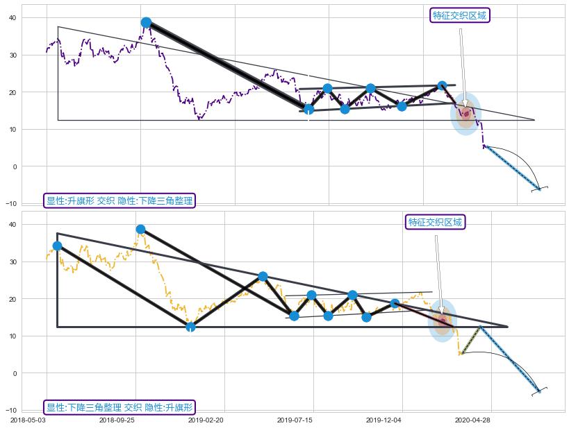 ➣ 下跌螺旋桨 + 下降三角整理支撑破位转换阻力下跌信号叠加后【目标达成率】中等,【看空】信号叠加【存续影响中等】