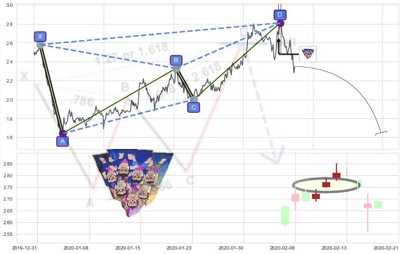 ➣ 谐波蝴蝶:已到达d点:猜想c拉升到达d点后泄力性下沉下跌(均值回复)