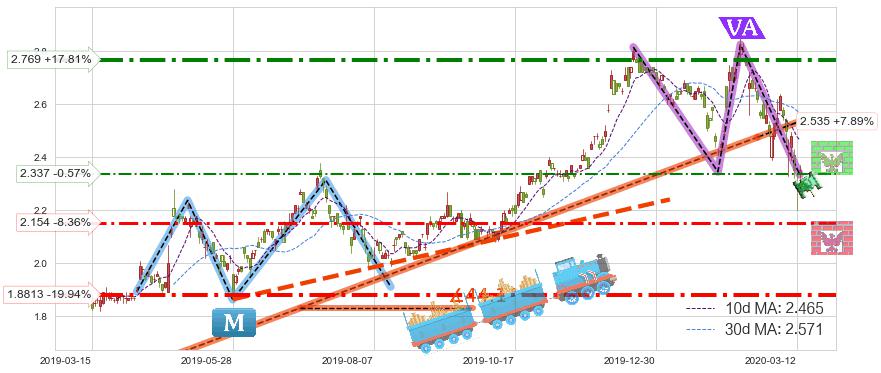 ♘ 支撑价格位2.154,可信任强度60.28%,距离最后交易2020-03-13形成的收盘价格2.350相差 -8.36%