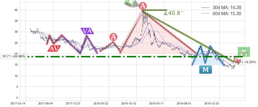 从2018-11-14至2020-03-13,共包含333个交易日,阶段股价下跌-84.47%,阶段股价变动位移路程比: 1 : 7,下跌趋势角度: 40.8