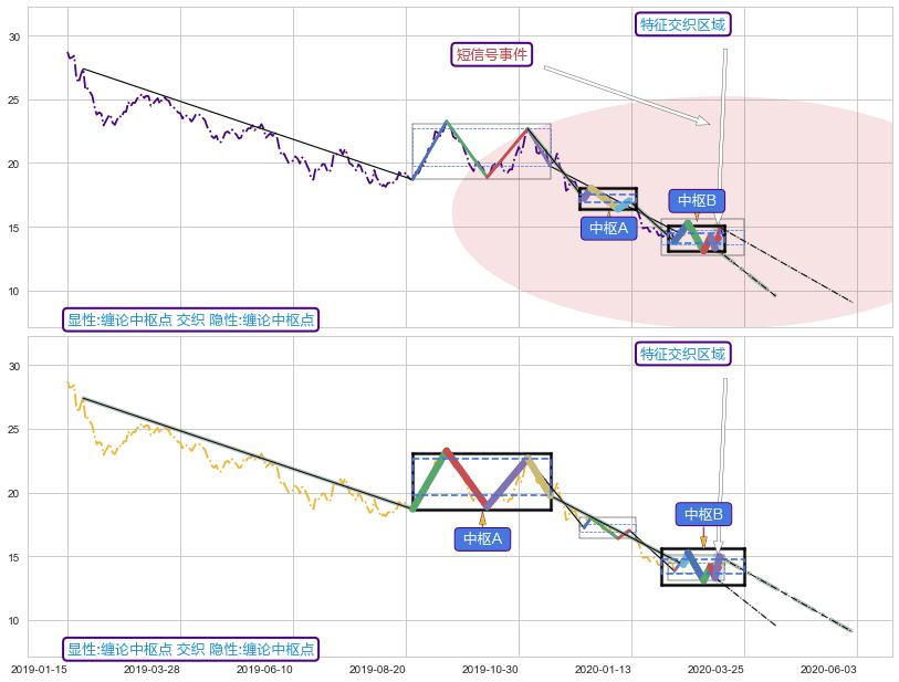 ➣ 缠论中枢点:猜想破位中枢B后持续下拉 → 下跌 → 破位中枢B支撑 → 持续趋势跟踪