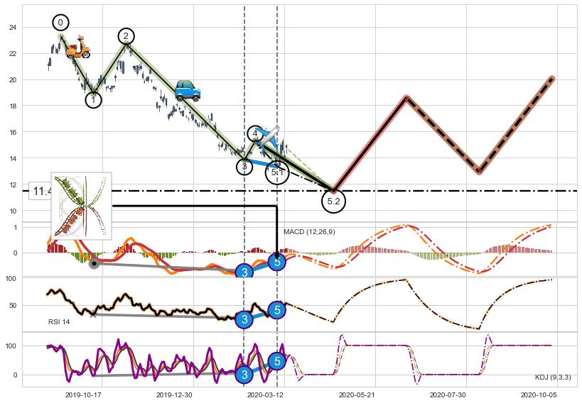 ➣ 5.1: 预测当前第5浪位置(2020-03-06, 13.32),仍然有下跌空间