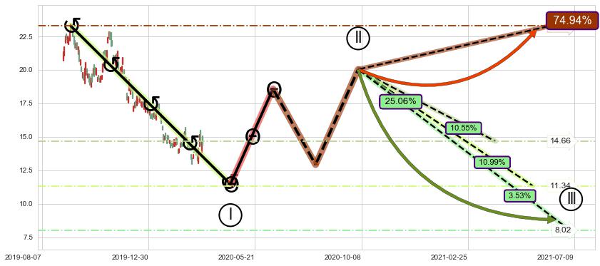 ➢ 循环浪继续向下【最低】位置(2021-07-09, 8.02),匹配聚类样本比例14.07%, 可能性概率3.53%