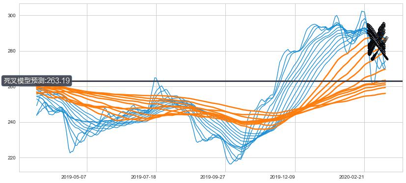 ➣ 70小时均线于(2020-03-04: 287.07)形成【死叉】基于【死叉历史模型】预测死叉后最低波谷价格: 261.20, 死叉后最低价格250.41,已经下跌超出预测最低波谷价格, 预期反弹