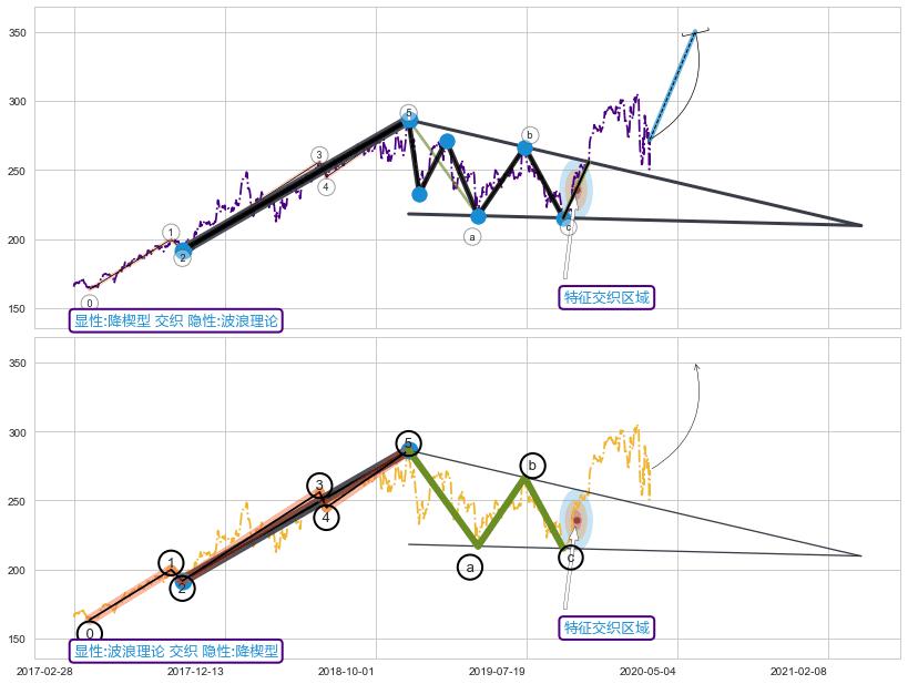 ➣ 上升三部曲(升势三鸦) + 降楔型阻力突破转换支撑上涨信号叠加后【目标达成率】中等,【看多】信号叠加【存续影响中等】