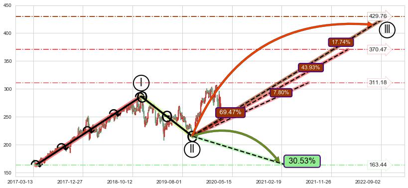 ➣ 循环浪继续向上【平均值】位置(2022-02-28, 370.47),匹配聚类样本比例63.24%, 可能性概率43.93%
