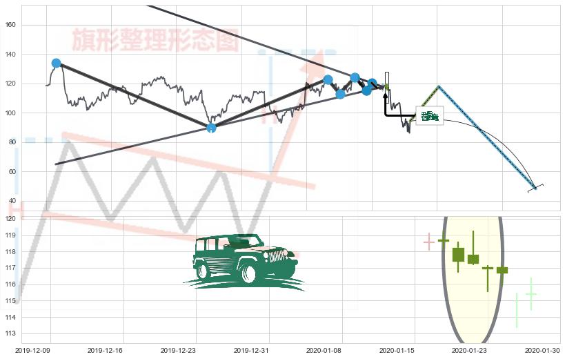 ➢ 升旗形:下跌target达成后 → 猜想下跌动能竭尽反转上涨 → 机会信号 → 大趋势均值回复