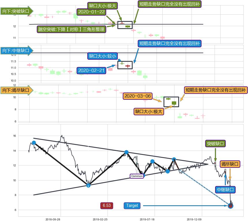 ➣ 普通缺口在【下降【对称】三角形整理】震荡整理形态中出现