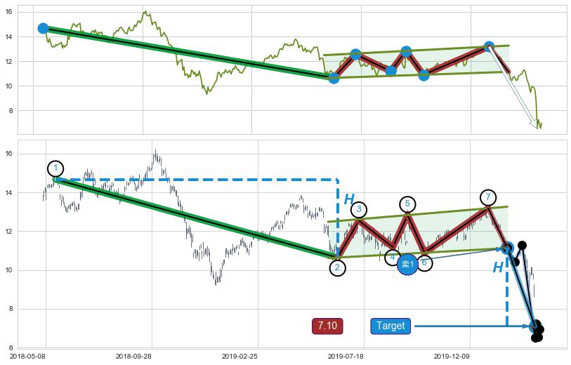 ➣ 升旗形:下跌target达成后 → 猜想下跌动能竭尽反转上涨 → 机会信号 → 大趋势均值回复