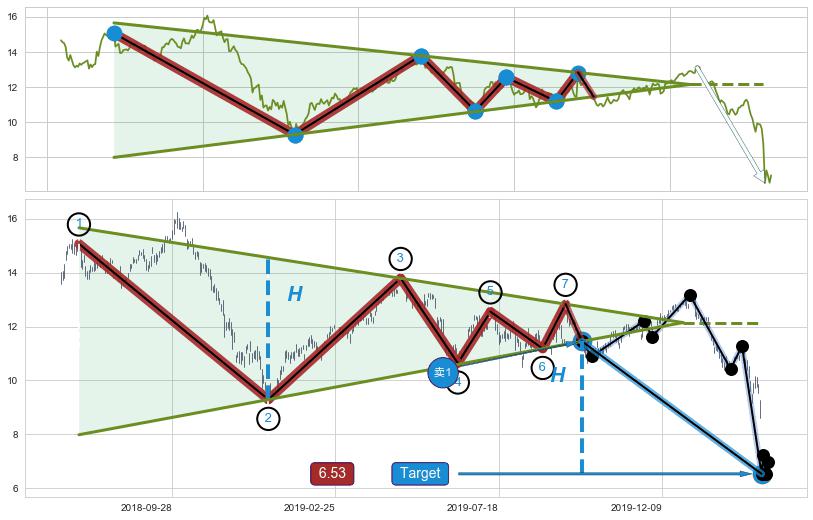 ➣ 下降对称三角整理:下跌target达成后 → 猜想下跌动能竭尽反转上涨 → 机会信号 → 大趋势均值回复