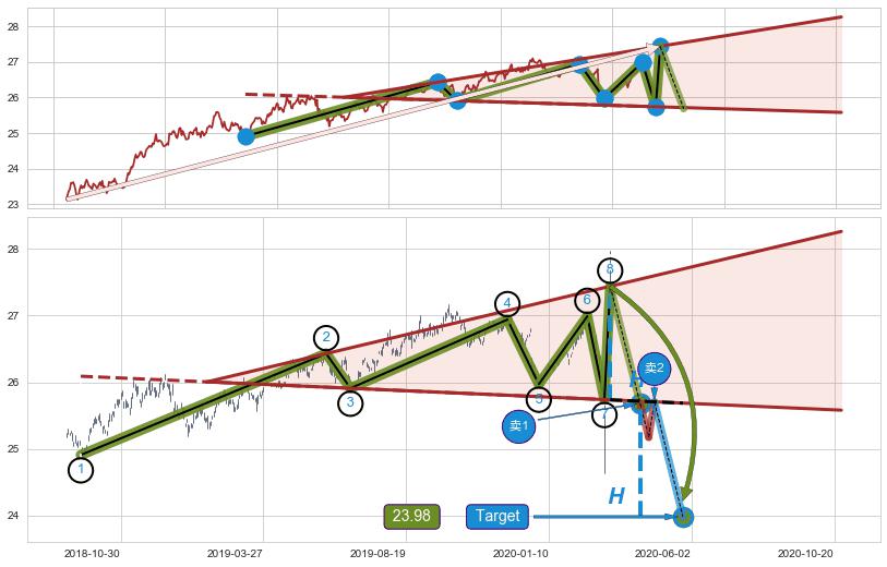 ➢ 扩散三角反转:猜想临近关键支撑位突破点 → 临近拐点下跌 → 风险信号 → 大趋势均值回复
