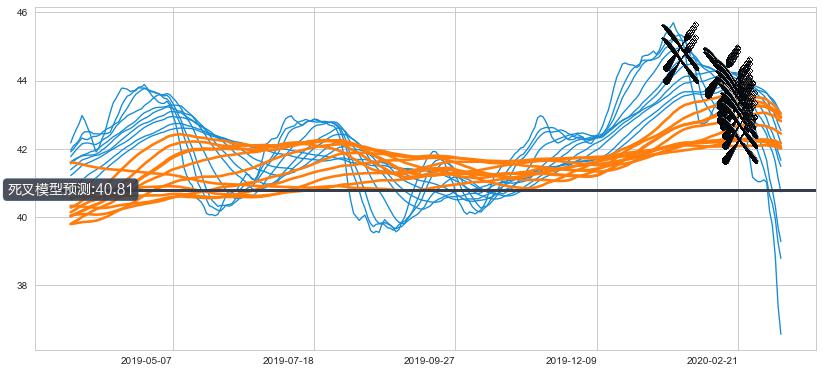 ➣ 70小时均线于(2020-02-19: 43.61)形成【死叉】基于【死叉历史模型】预测死叉后最低波谷价格: 41.38, 死叉后最低价格33.55,已经下跌超出预测最低波谷价格, 预期反弹