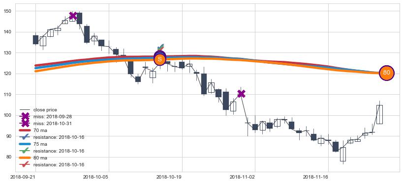 ➢ 最优均线组合共正确确认支撑阻力信号4处,正确确认率 44.44%