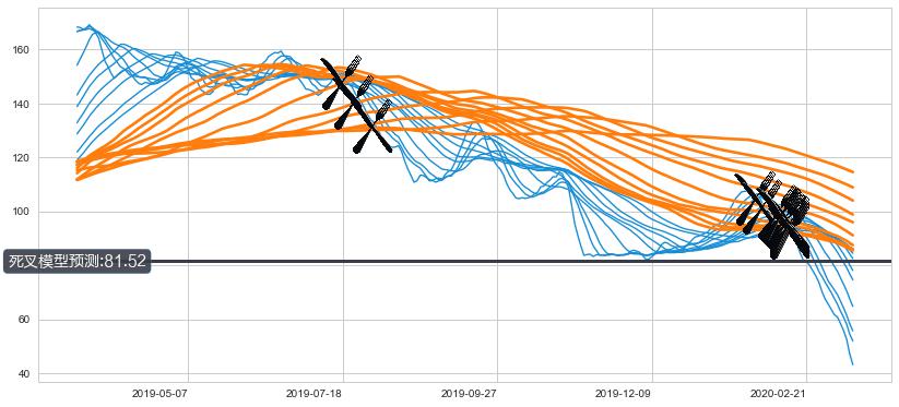 ➣ 70小时均线于(2020-02-12: 91.78)形成【死叉】基于【死叉历史模型】预测死叉后最低波谷价格: 75.97, 死叉后最低价格33.00,已经下跌超出预测最低波谷价格, 预期反弹